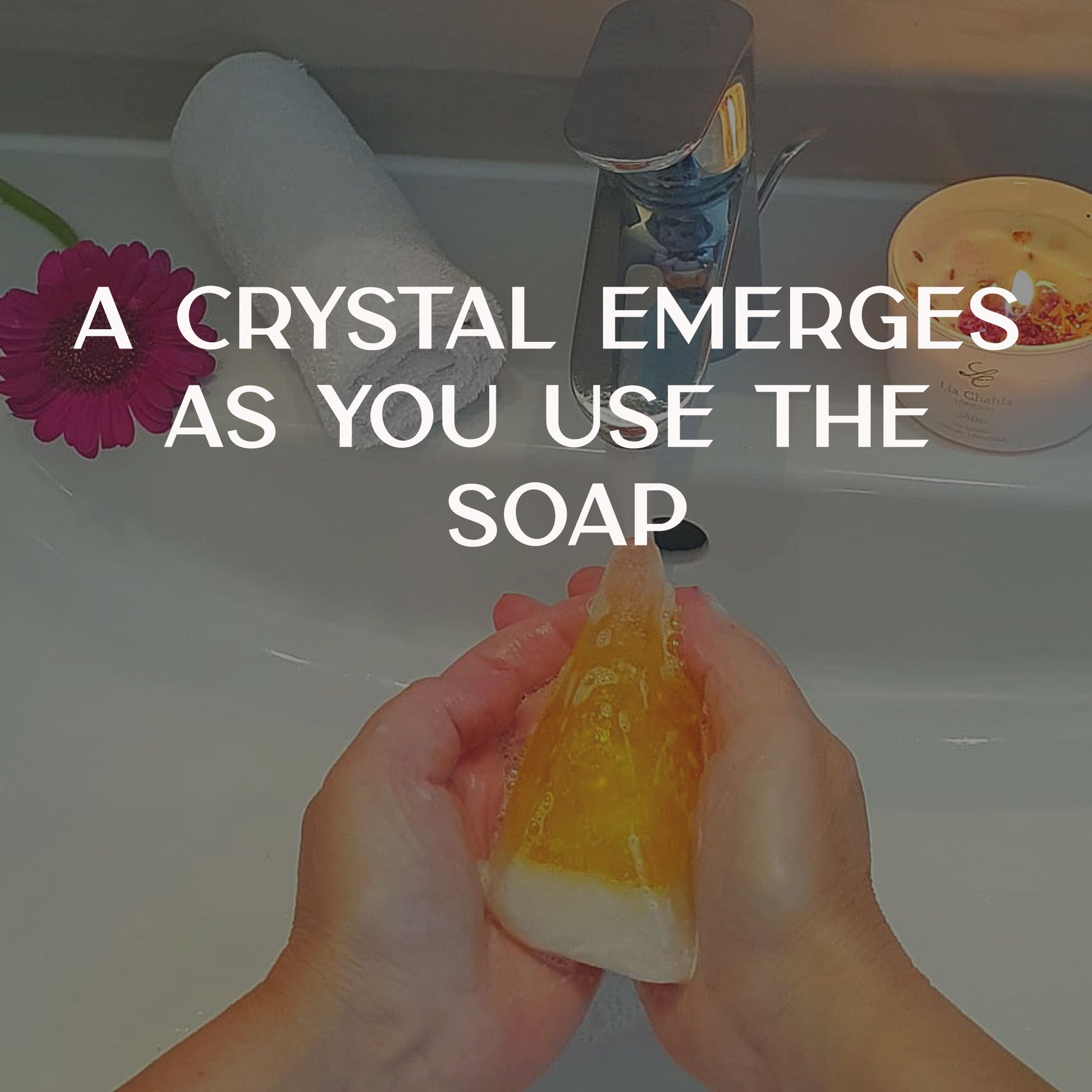 - Orange Blossom Soap, delicately infused with a heart-shaped Citrine crystal inside. Citrine is known as the stone of abundance, confidence, and positivity, making this soap not just a cleansing experience, but an uplifting one that energises both body and mind.