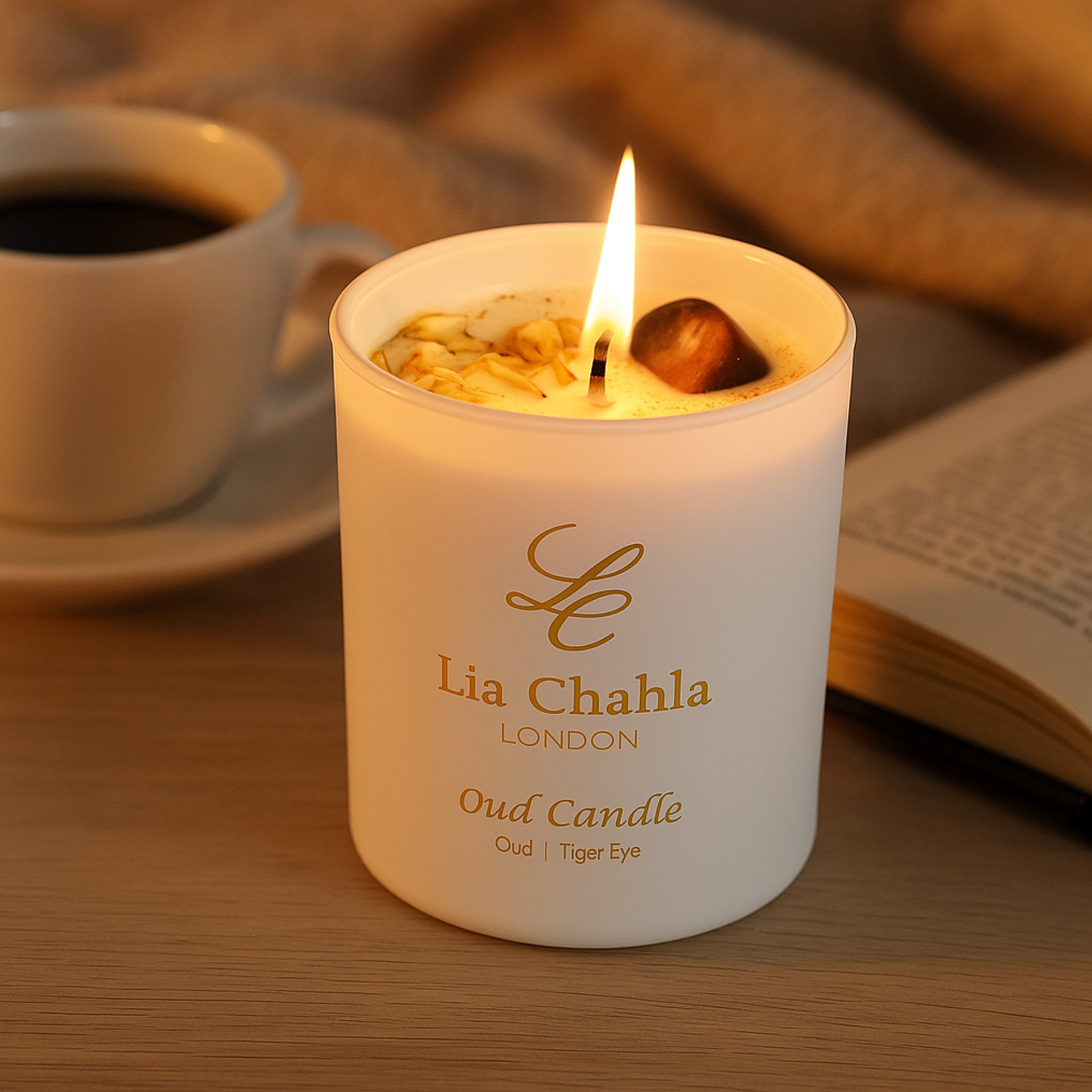 - Oud & Sandalwood Soy Candle, infused with genuine Tiger Eye crystals and delicate jasmine florals. Rich, warm, and deeply grounding, the fusion of oud and sandalwood creates an atmosphere of strength and serenity, while Tiger Eye is known for enhancing courage, protection, and focus. The subtle jasmine notes add a touch of elegance, making every burn a grounding yet luxurious ritual.