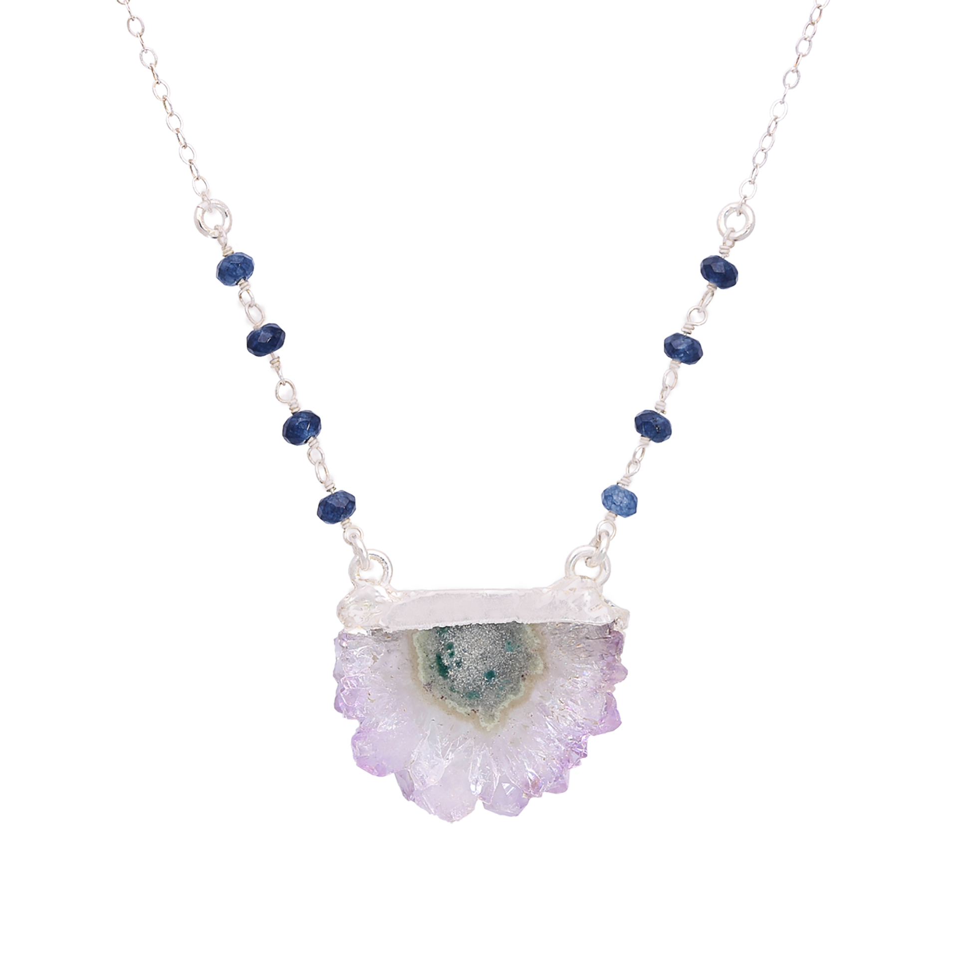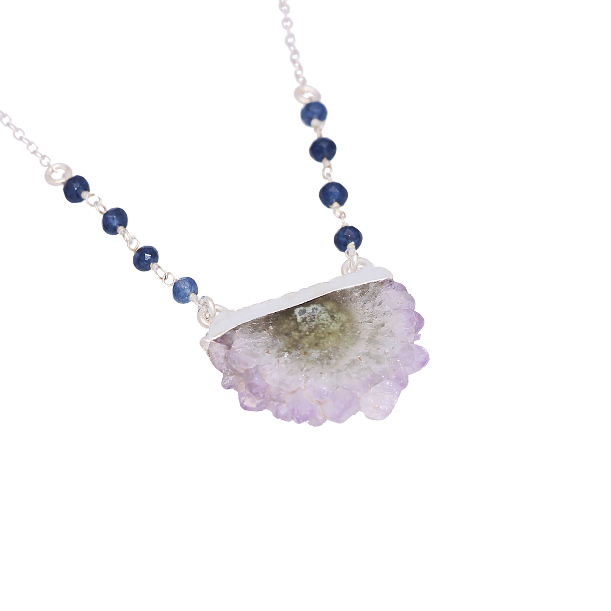 Elegant necklace with natural half moon amethyst slice designed with natural blue spinel gemstones and Sterling silver chain. The amethyst slice has a silver electroplated edge showcasing its natural beauty. Hues of colours merged into this stone, Mother Nature created the piece with love and care. The solidity of light purple and white tones in this raw stone is perfect for the daring enthusiast of a woman who delivers energy in her aura.