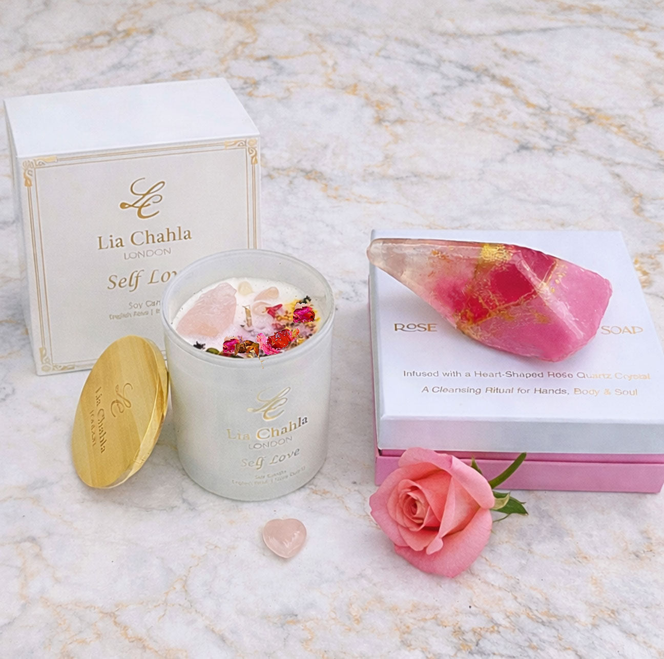 Indulge in timeless elegance with our English Rose Soy Candle, a romantic floral masterpiece from Lia Chahla London. Hand-poured using natural soy wax and delicately infused with the classic scent of blooming English roses, this luxury candle is elevated with genuine Rose Quartz crystals, real rose florals, and a subtle shimmer of decorative glitter for a truly enchanting finish.
